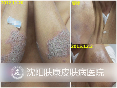 2015年11月20日,老汉来到了沈阳肤康医院,医师王璐副院长接诊了他。王副院长说:"他来的时候吧,诊断是湿疹,有的局部皮损已经 转变成银屑病了,上面银白色的鳞屑,很典型的银屑病,然后腿上呢,还是角化性湿疹,有渗出。我们采用中西医结合治疗,配合水疗、汽疗和光疗,两天做一 次。"